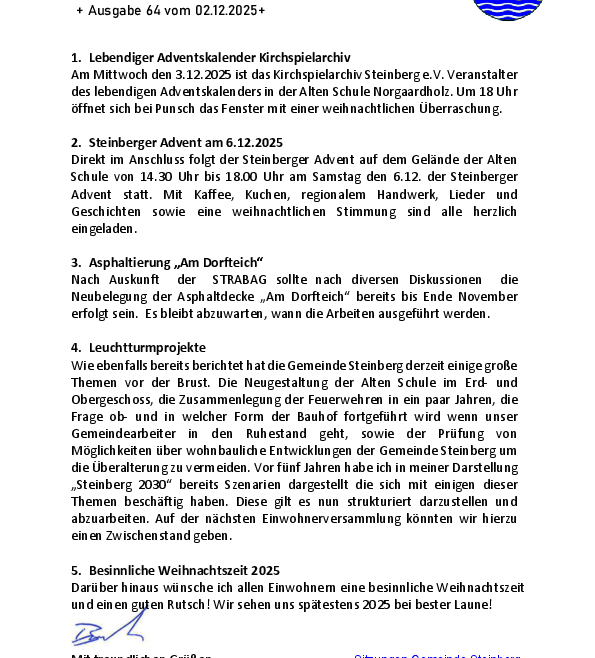 Bi uns to Hus in Steenbarg – ein Bürgermeister berichtet + Ausgabe 64 vom 02.12.2025+